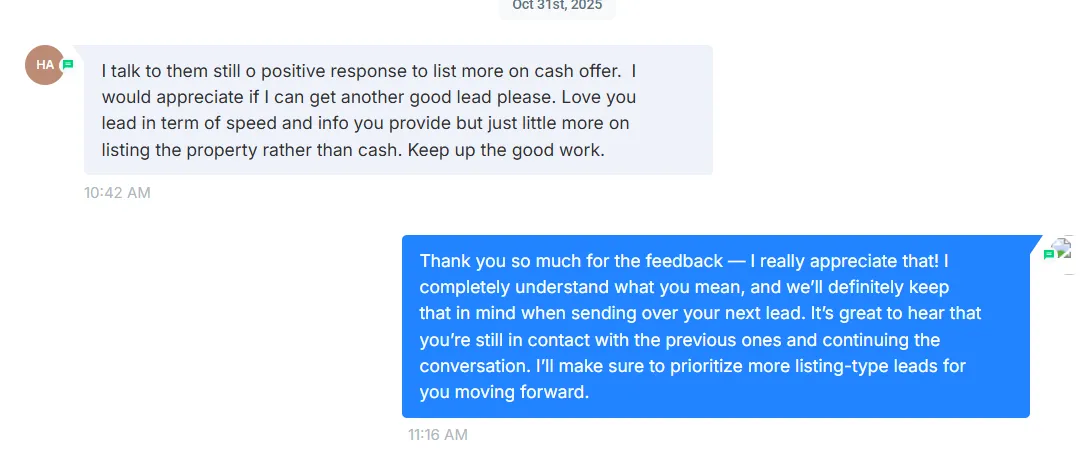 "The quicker you send them [Leads], I'm gonna keep calling them, buying them; It's a good lead source..."